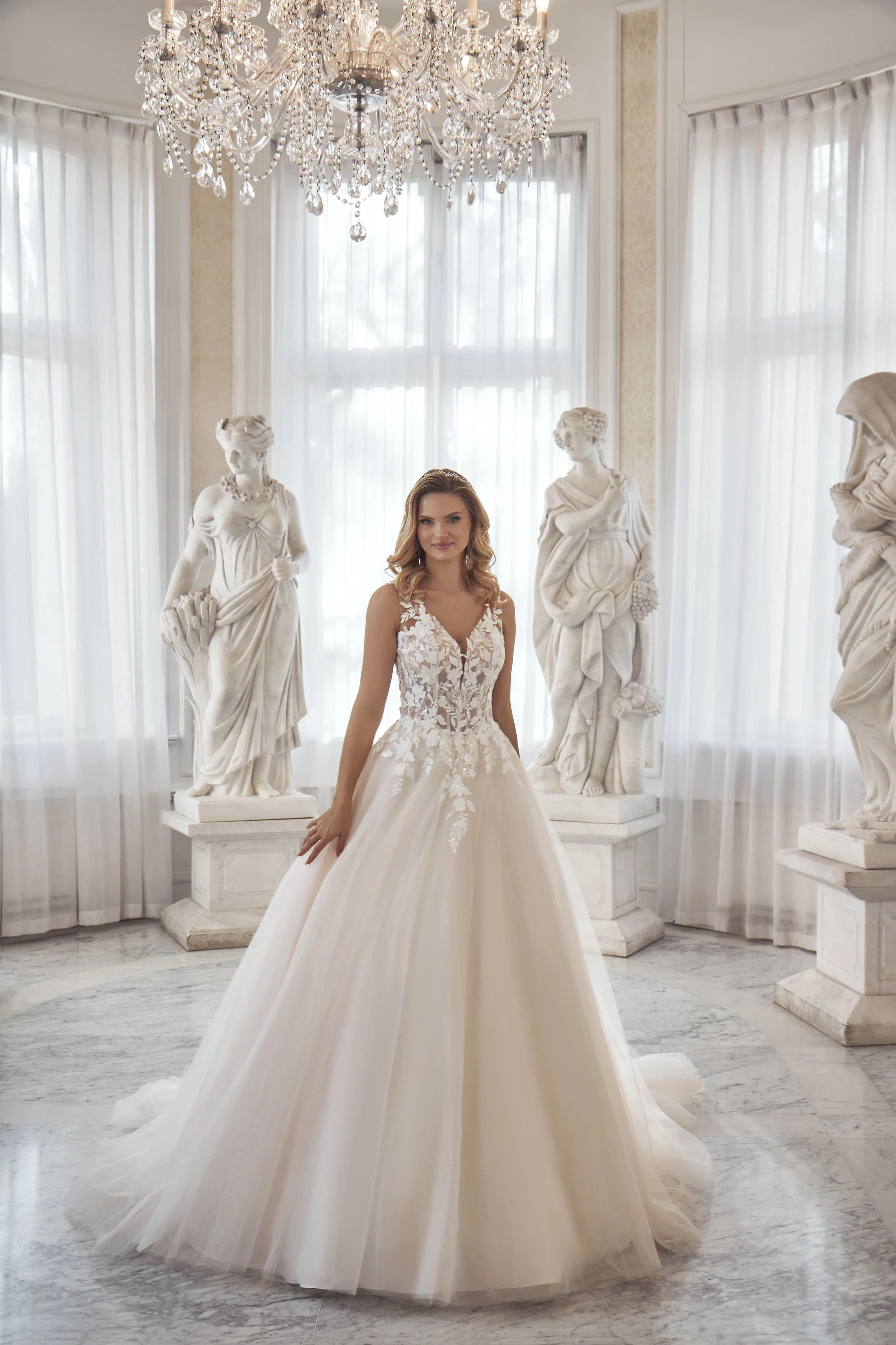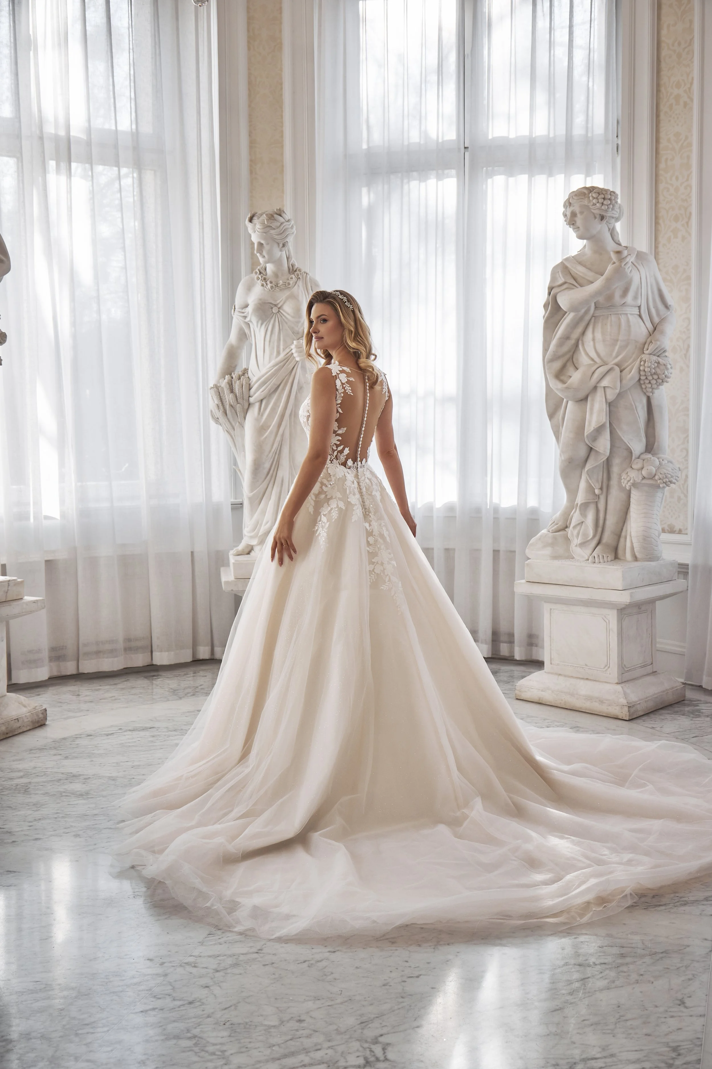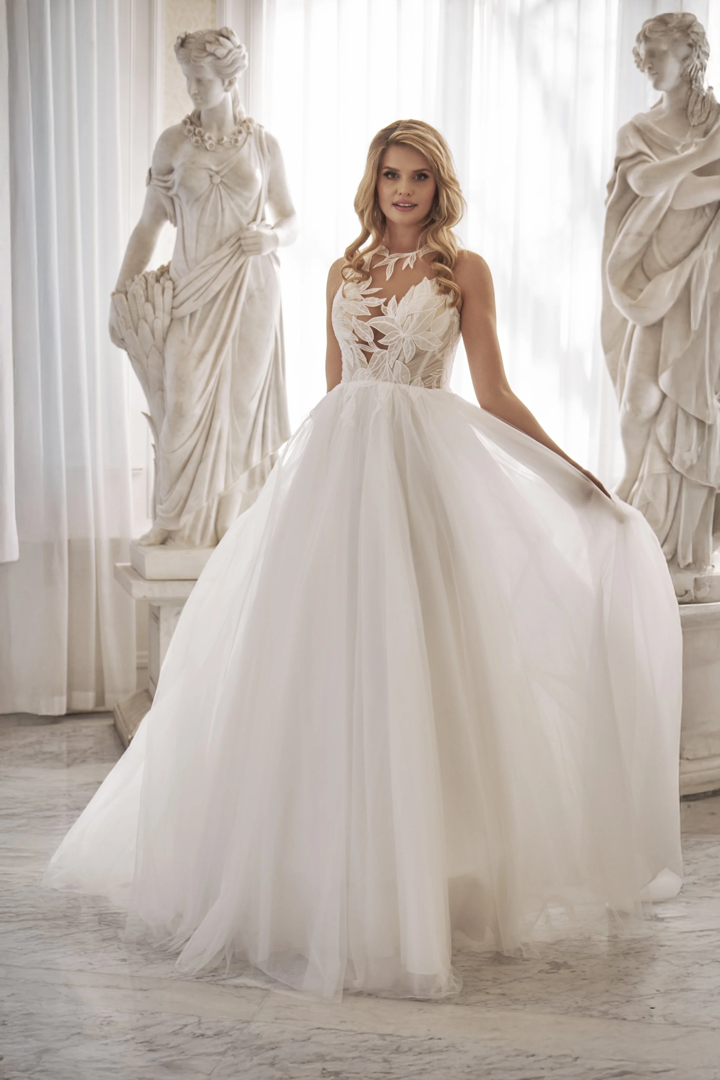 The bodice is finished with hand-embroidered lace, bringing texture and detail while maintaining a light, airy feel. The soft tulle skirt creates volume and movement, resulting in a silhouette that feels modern, feminine and naturally elegant.