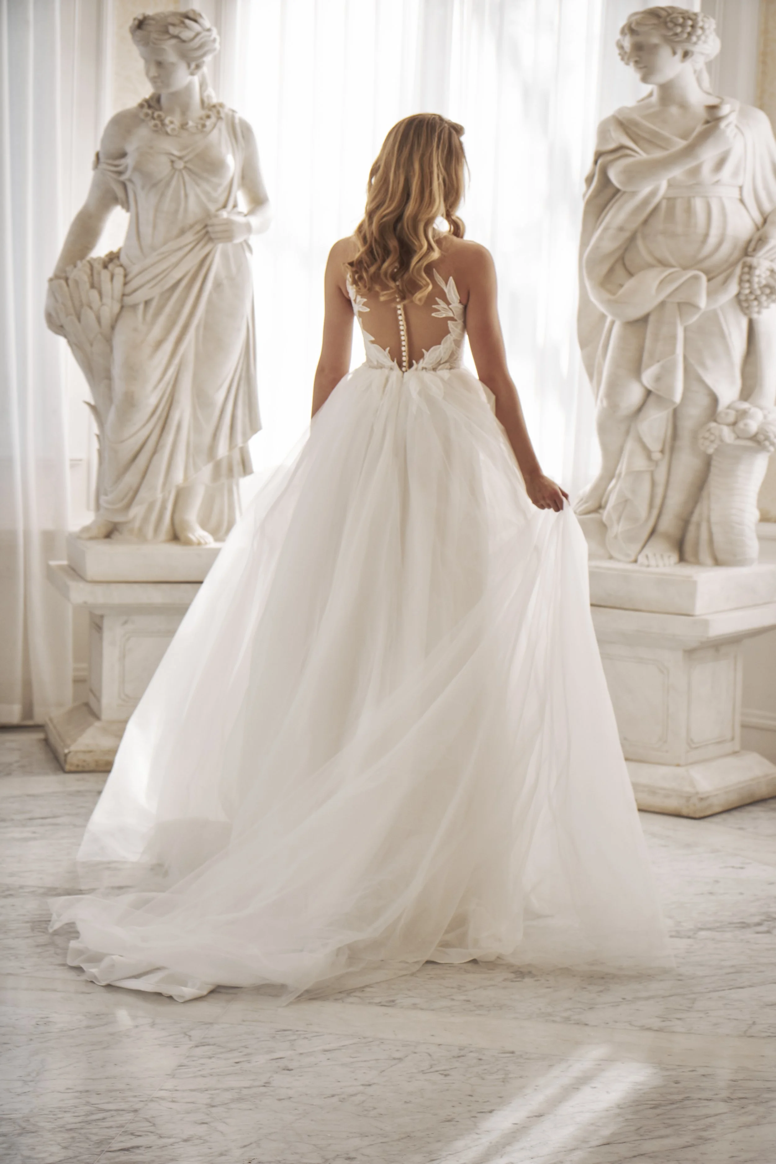 The tulle skirt falls lightly and creates volume without heaviness, giving the gown an airy, effortless feel. The back is thoughtfully designed to leave a lasting impression, completing a look that feels both modern and timeless.
