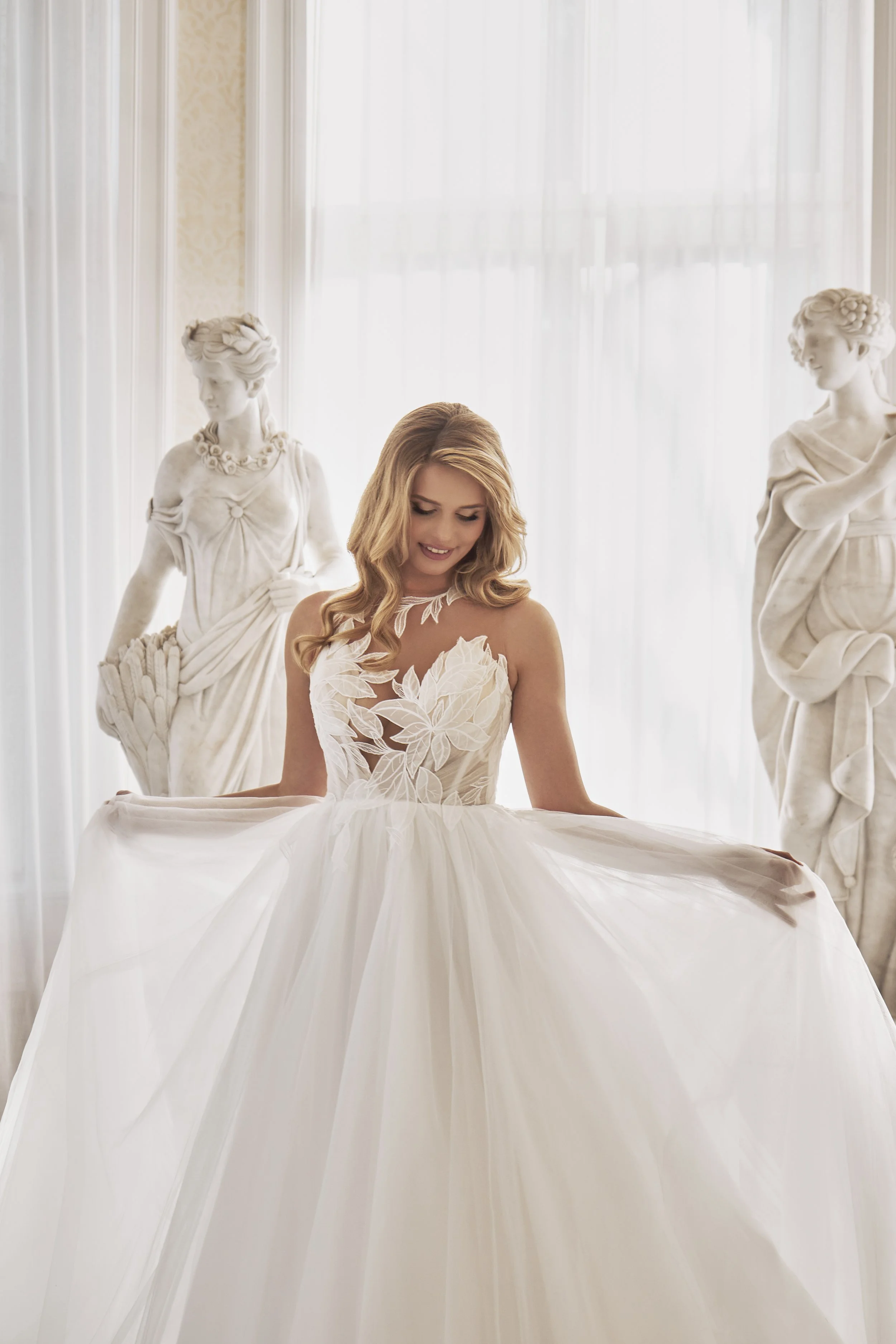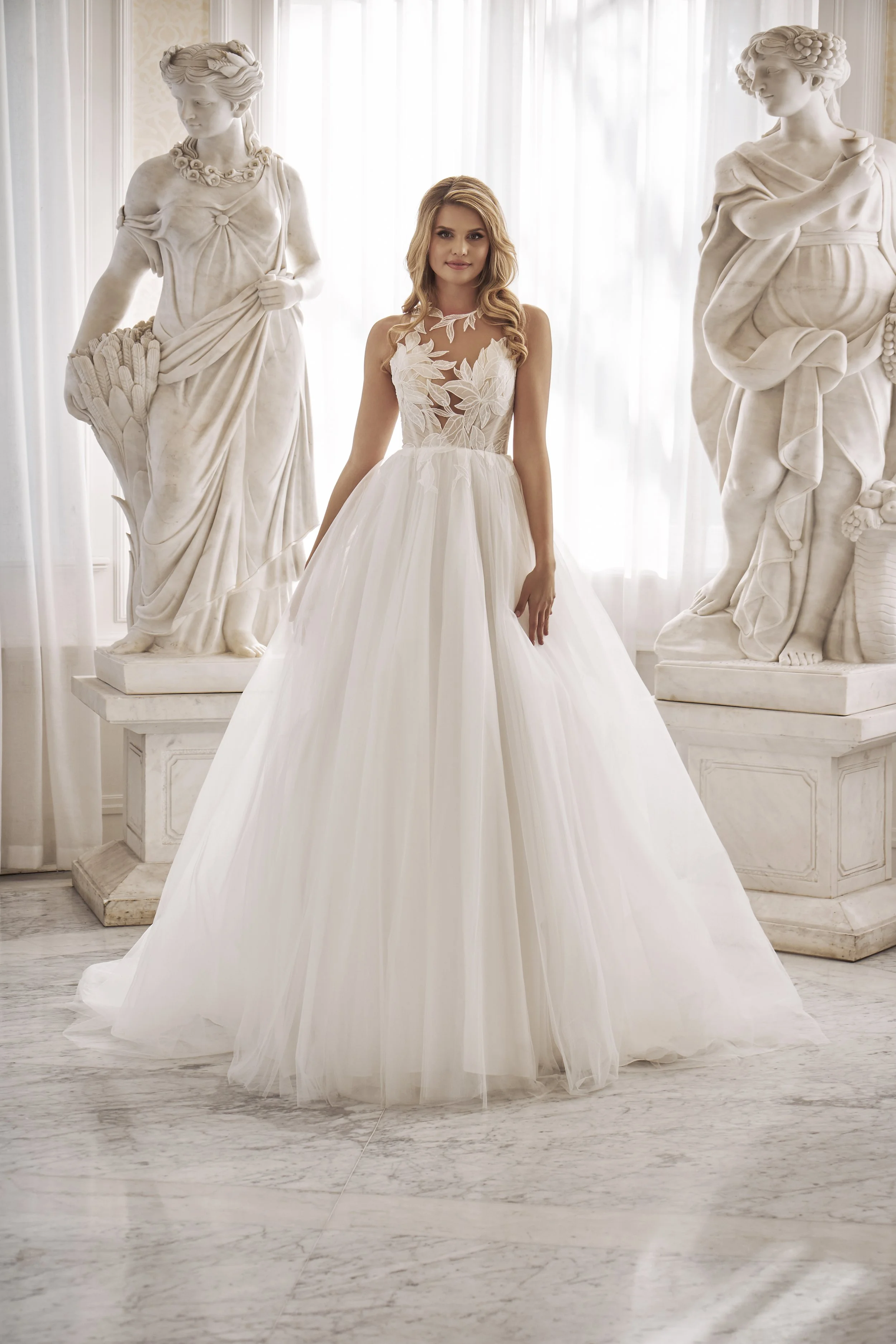This design blends contemporary structure with delicate softness. The high neckline creates a clean, modern frame, while the leaf lace bodice adds texture and subtle dimension.