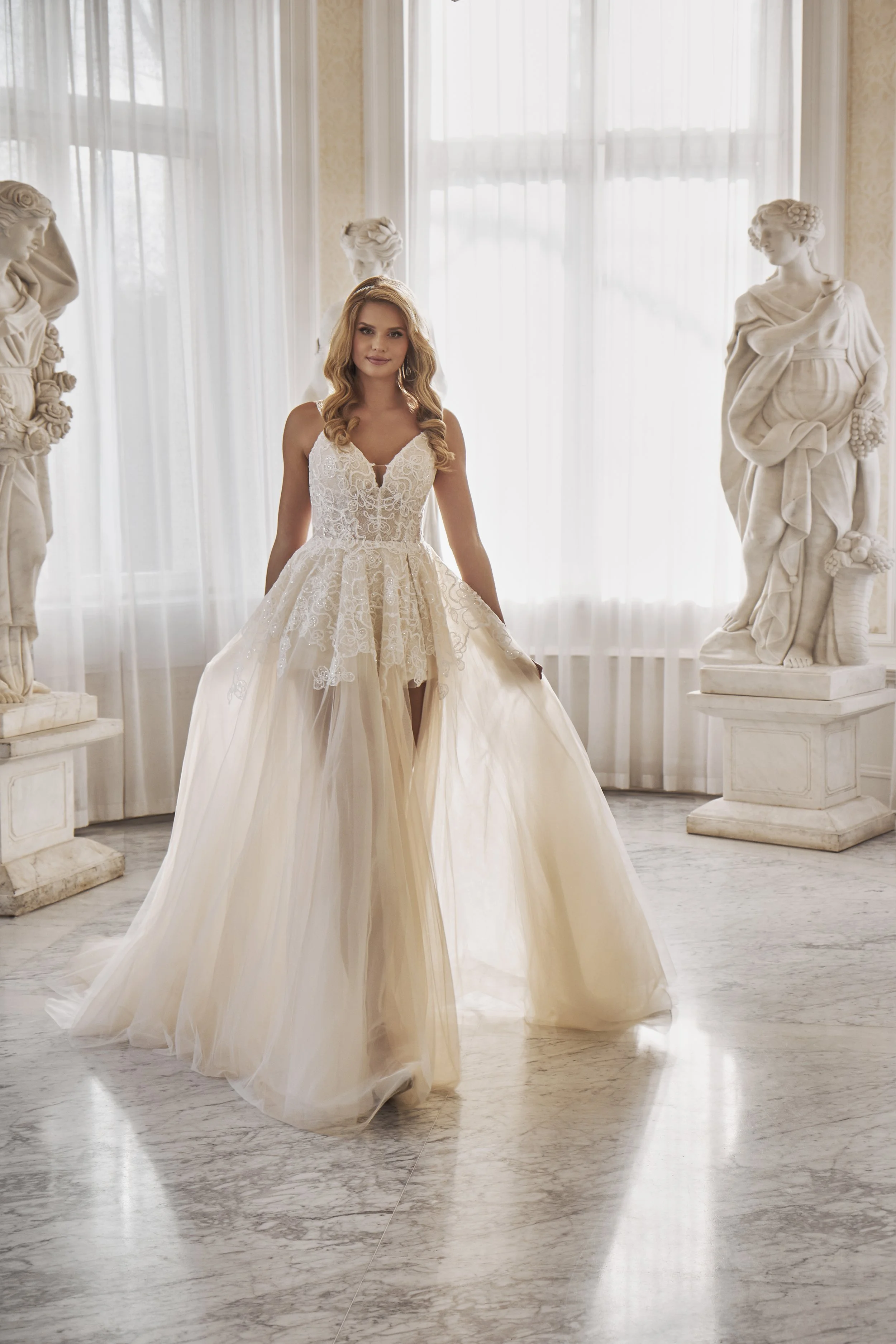 A contemporary bridal design that combines romance with a bold, fashion-forward twist. The airy tulle skirt creates volume and movement, while a shorter inner layer subtly reveals the legs and adds a playful edge.