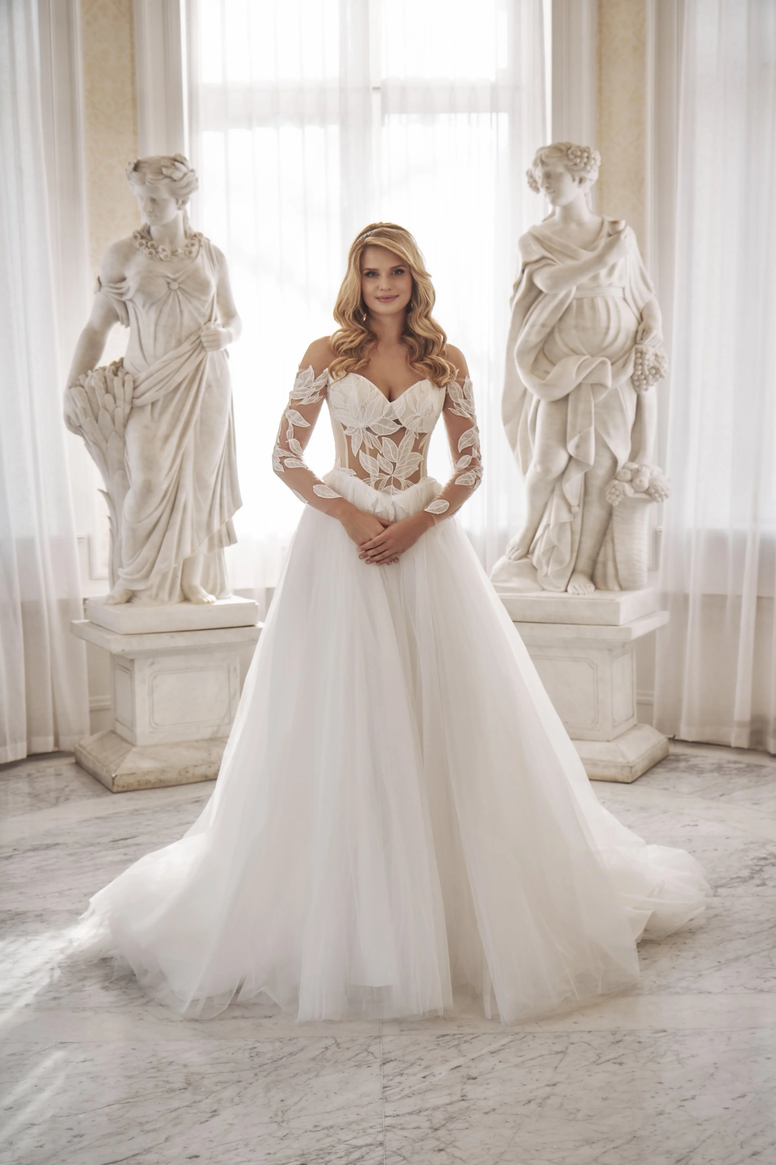 The lace flows naturally into the skirt, creating a seamless transition between structure and movement. Long lace sleeves add elegance and balance, while the lace-up back ensures a perfect fit. A modern princess silhouette made for brides who want something light, feminine and quietly striking.
