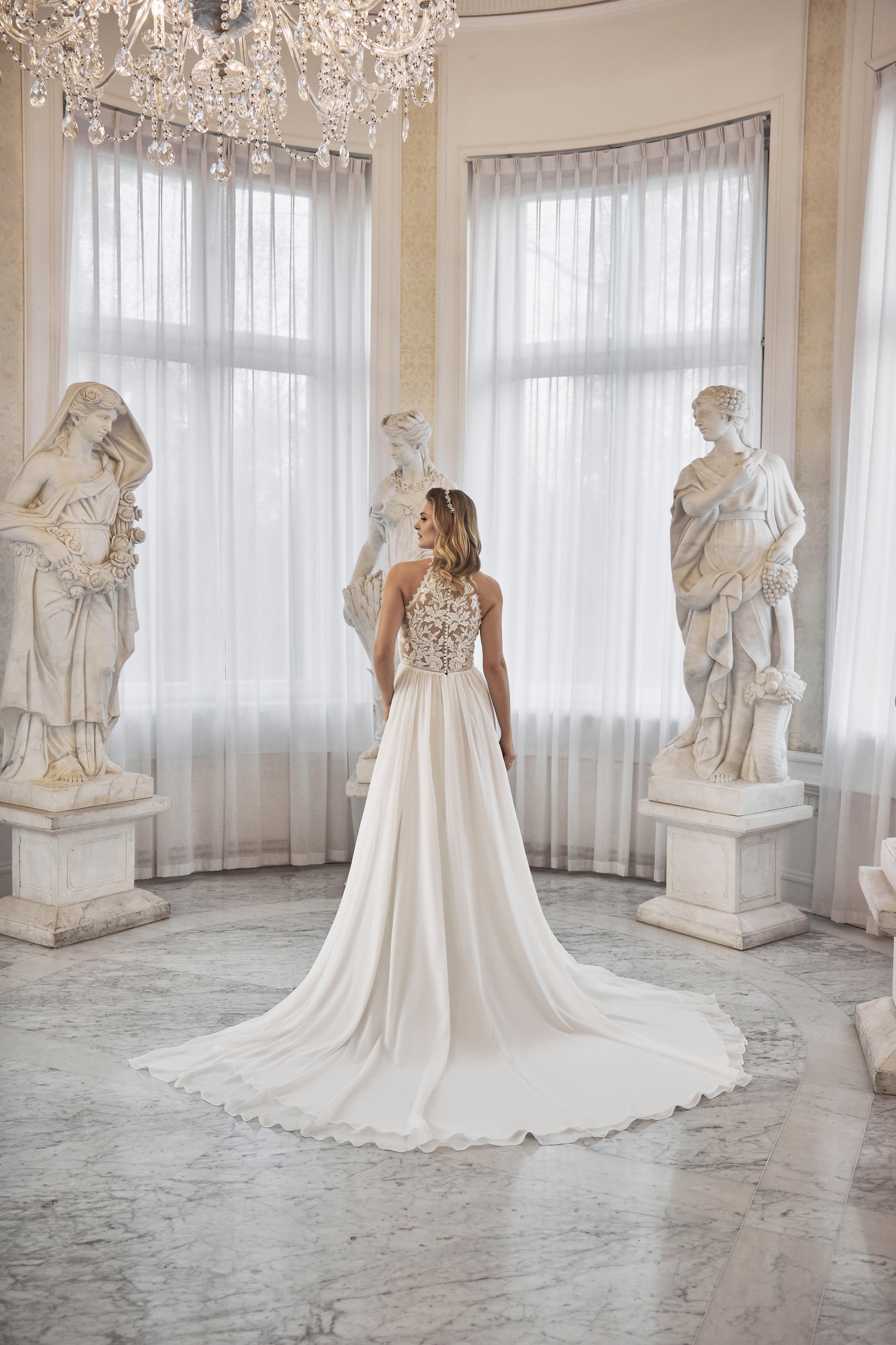 The design keeps distractions to a minimum, allowing the fabric and cut to take the lead. A perfect choice for brides who want something strong, modern and effortlessly stylish.
