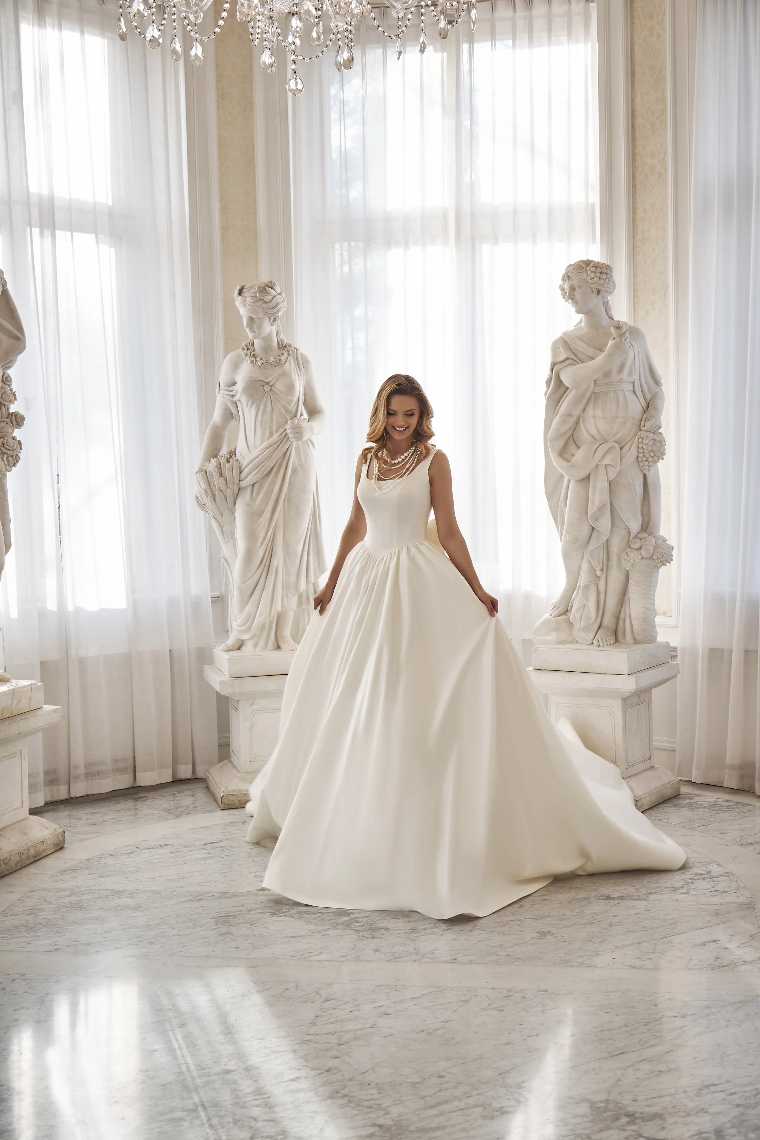 This elegant satin wedding dress features a clean, structured bodice paired with a voluminous, flowing skirt that creates a truly timeless bridal look. The minimalist design highlights the beauty of the fabric, allowing the luxurious satin to take center stage.