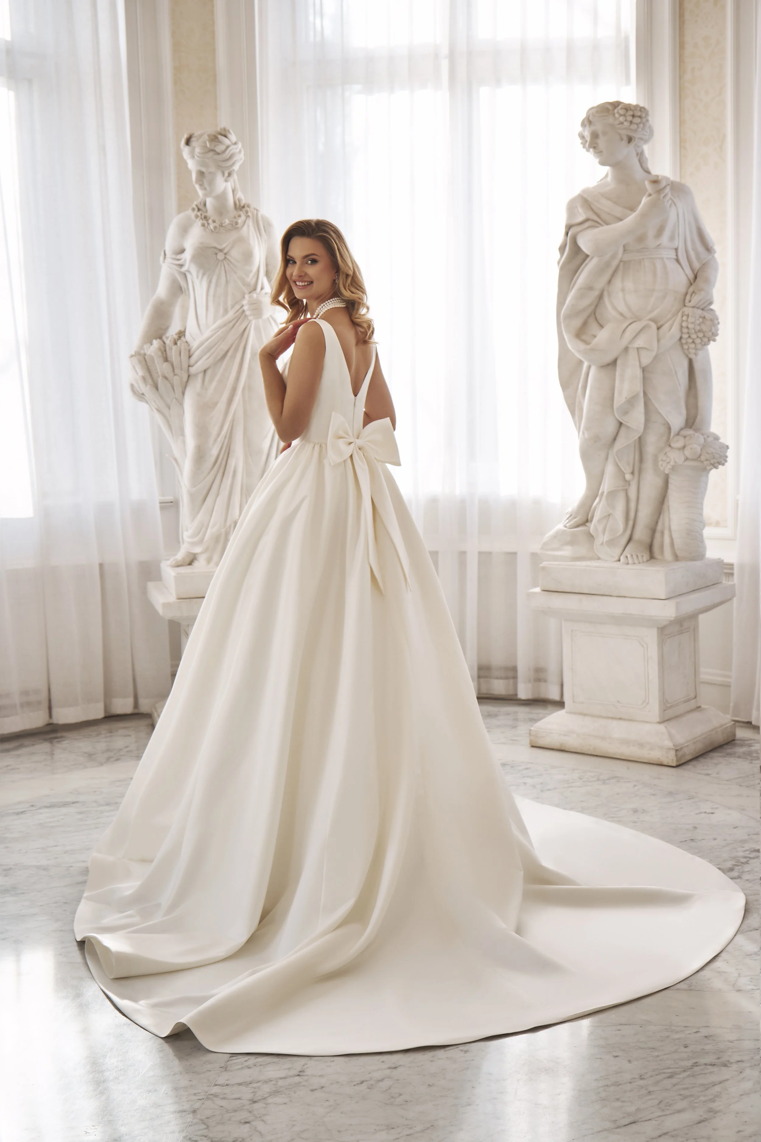 The fitted waist enhances the silhouette, while the full skirt adds movement and a sense of effortless grandeur. Perfect for brides who appreciate classic elegance with a modern, refined touch.