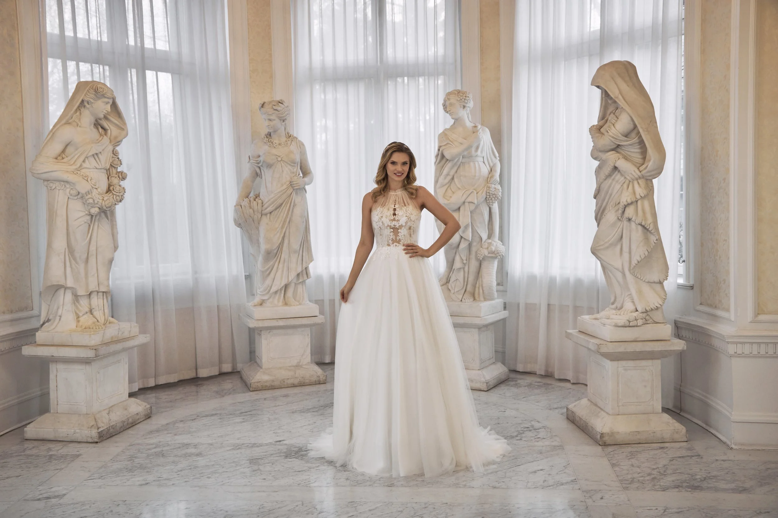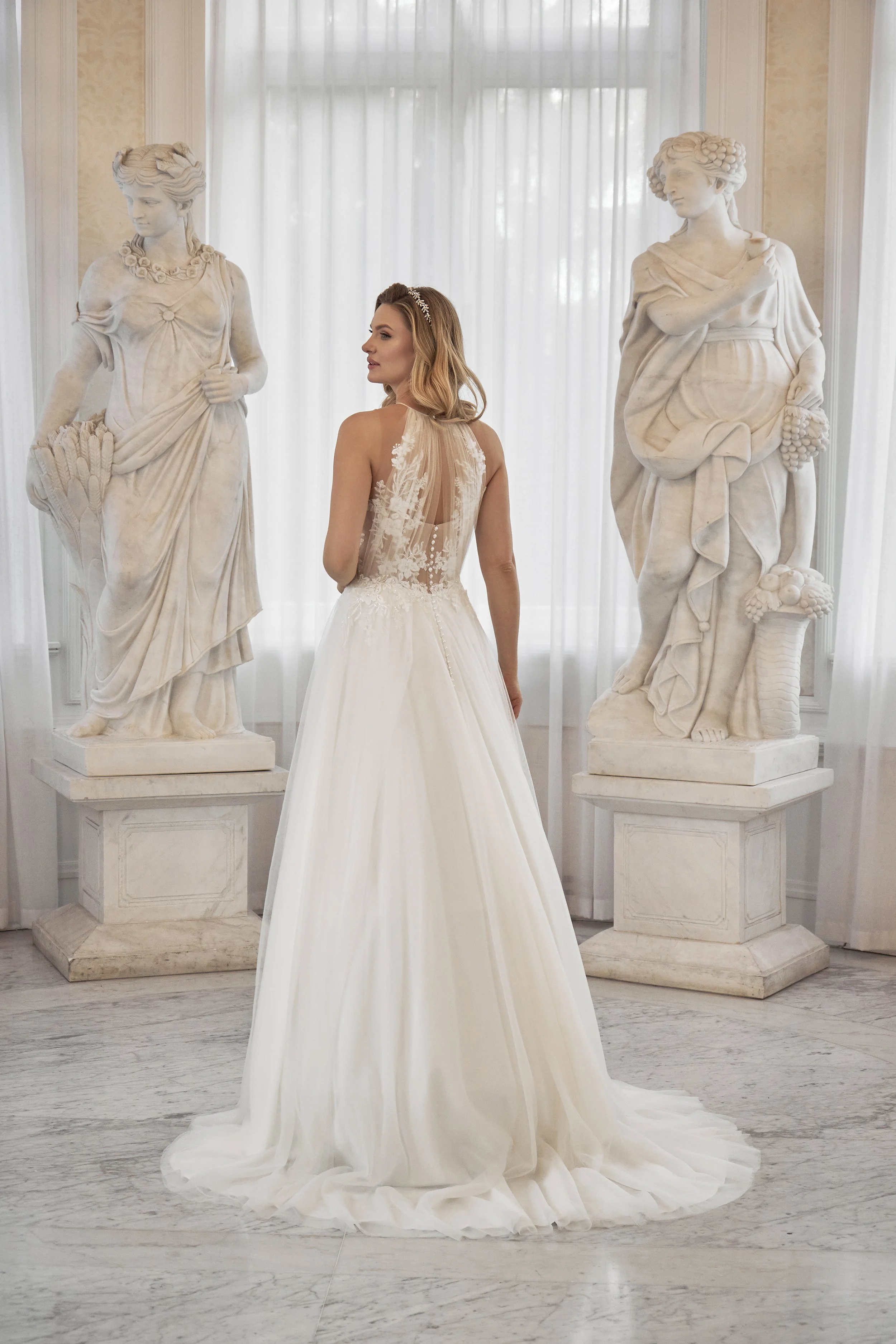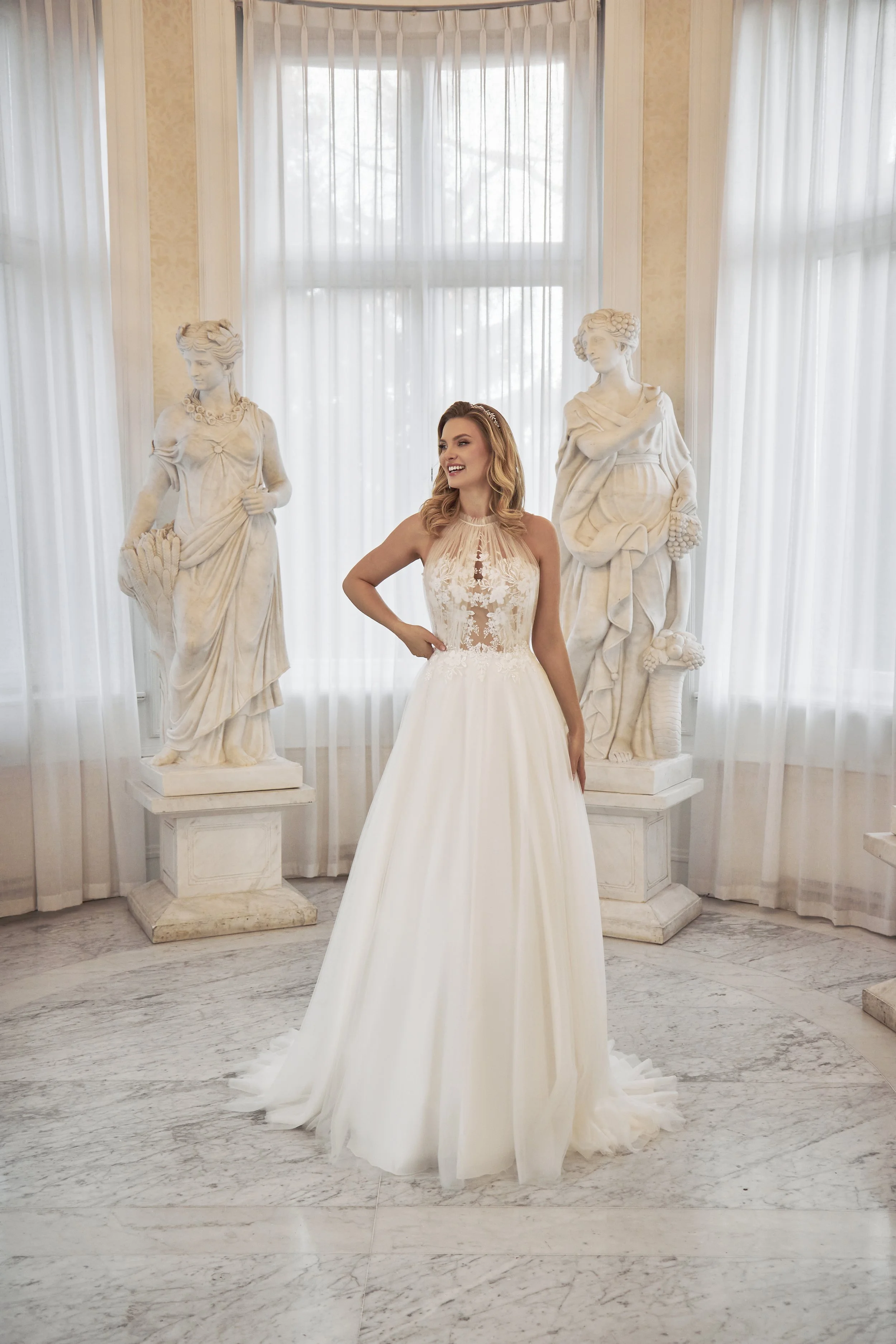 This stunning A-line wedding dress features a soft, flowing tulle skirt combined with a beautifully detailed lace bodice. The high neckline creates an elegant, refined look, while the sheer elements add a subtle touch of sensuality.
