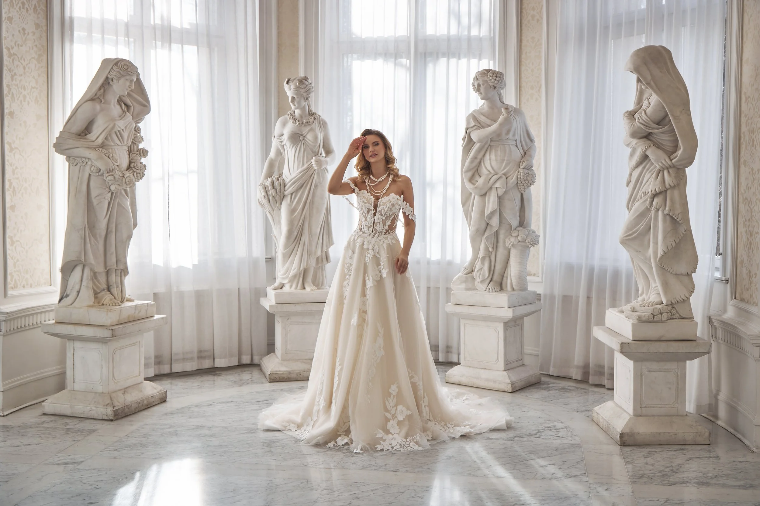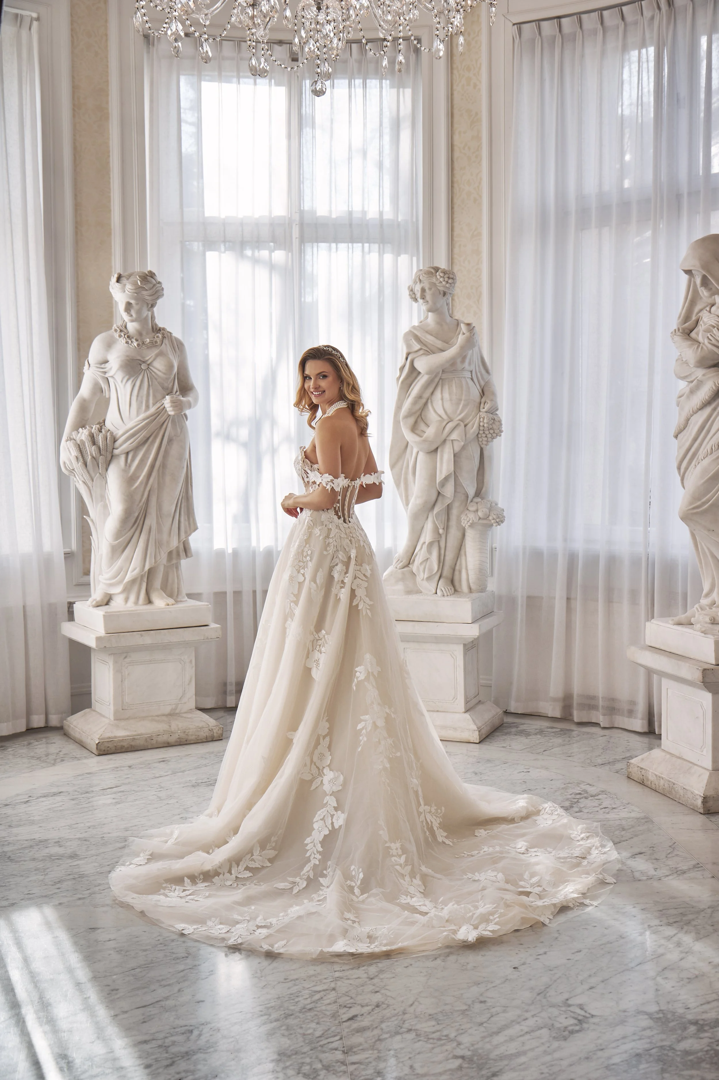 A romantic statement piece – this tulle wedding dress combines delicate embroidery with a modern, feminine silhouette.